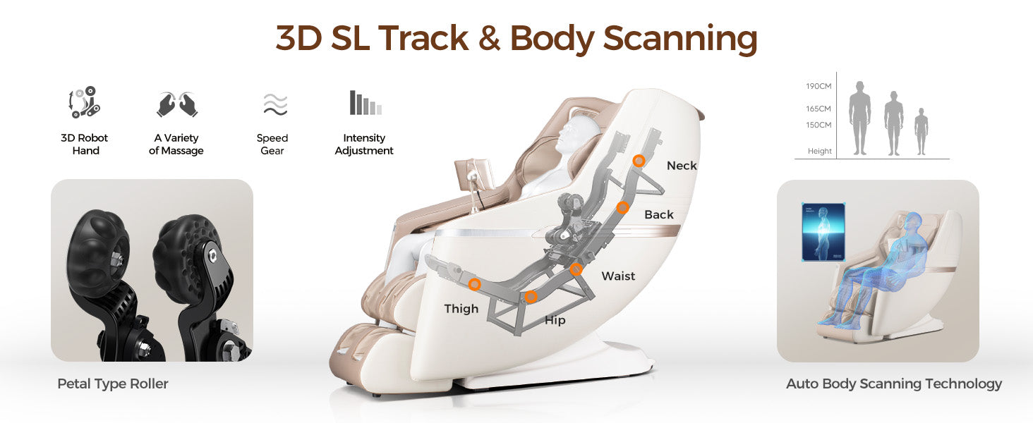 ·【3D SL-Track Shiatsu Massage】Deep-kneading rollers follow your spine from neck to thighs for full-body relief.