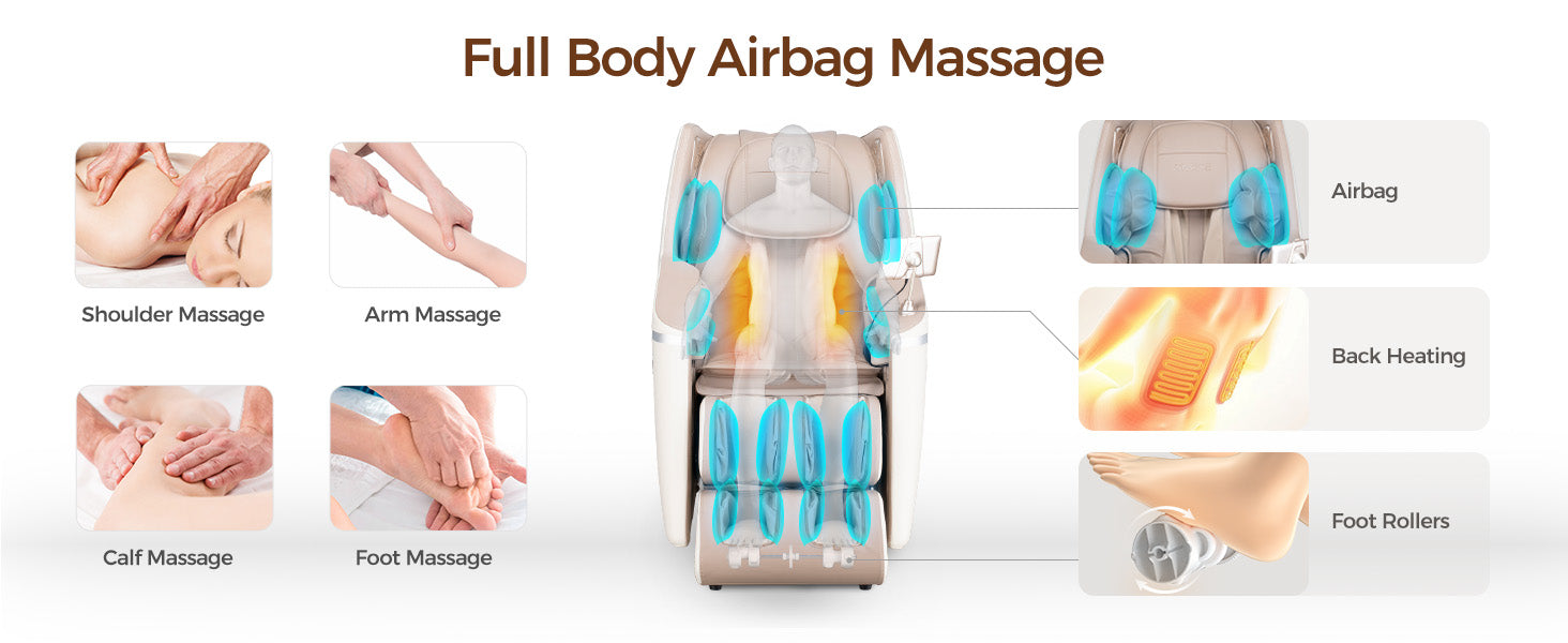 ·【Full-Body Airbag Compression Massage】36 airbags target shoulders, arms, legs & feet with 3 intensity levels.
