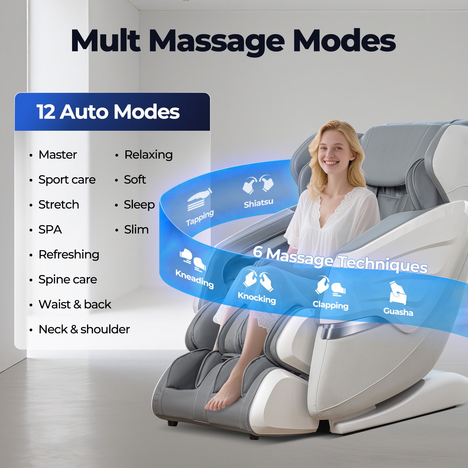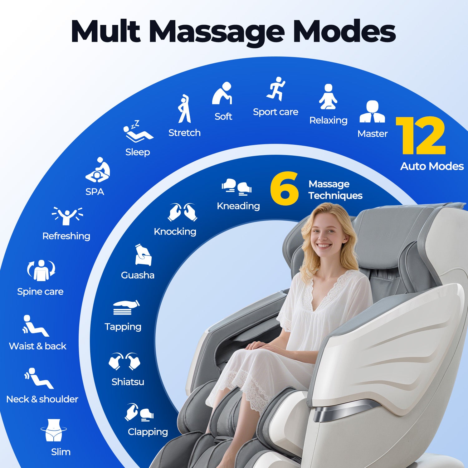 ·【Heated Back & Waist】 Soothing warmth helps relax stiff muscles and improves circulation. ·【Full-Body SL Track with 3D Rollers】Delivers deep, head-to-thigh massage that follows your spine's natural curve. ·【Smart Body Scan】Automatically adapts to your height and body shape. ·【Zero Gravity Recline】Reduces pressure on your back and boosts overall relaxation. ·【Foot & Calf Massage】Airbags and rollers relieve soreness from feet to calves. ·【Extendable Footrest】Fits users from 5'1" to 6'1" for a more customized experience. ·【12 Auto Modes & 6 Techniques】Choose from preset programs like Relax, Stretch, and Sleep. ·【Smart App & Remote Control】Adjust everything easily from your phone or remote. ·【Built-in Bluetooth Speaker】Play music or nature sounds to enhance your massage session.