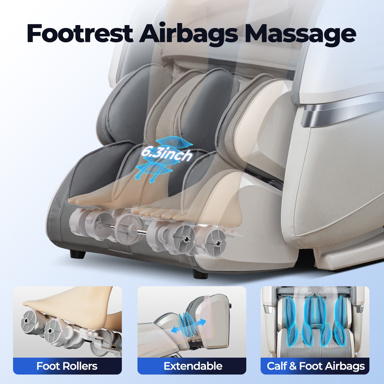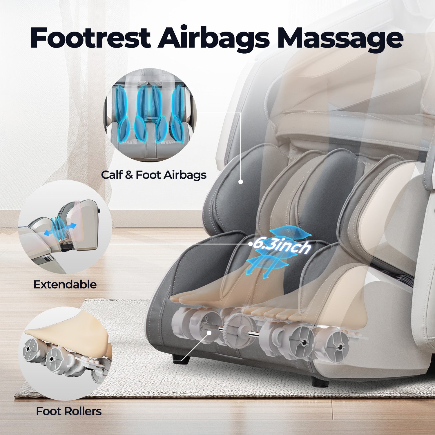 Relax from the knees down with soothing foot rollers, calf-compressing airbags, and an extendable footrest that fits users up to 6'1". It's a personalized spa experience for tired legs and feet—anytime you need it.